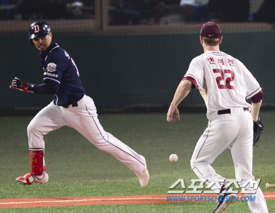오재원은 투수 앞 내야안타로 출루했다. 1루 측 데시벨은 더욱 높아졌다. 하지만 넥센 밴 헤켄은 날카로운 견제로 오재원을 아웃시켰다. 장군멍군이었다. 목동=류동혁 기자 sfryu@sportschosun.com