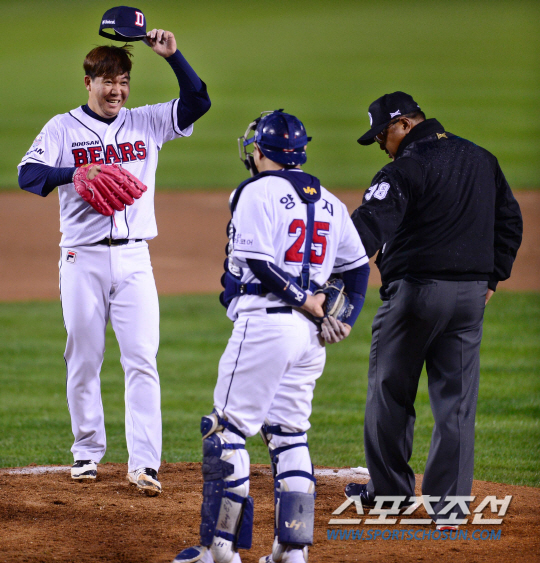 11일 오후 서울 잠실야구장에서 2015 프로야구 준플레이오프 2차전 넥센과 두산의 경기가 열렸다. 9회초 두산 이현승이 마운드가 미끄럽다며 웃고 있다. 잠실=김경민 기자 kyungmin@sportschosun.com / 2015.10.11.