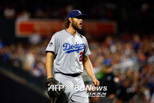 LA 다저스 클레이튼 커쇼가 14일(한국시각) 뉴욕 메츠와의 디비전시리즈 4차전에서 삼진을 잡아낸 뒤 포효하고 있다. 커쇼는 7이닝 2안타 1실점의 호투를 펼치며 포스트시즌 5연패의 늪에서 벗어났다. ⓒAFPBBNews = News1