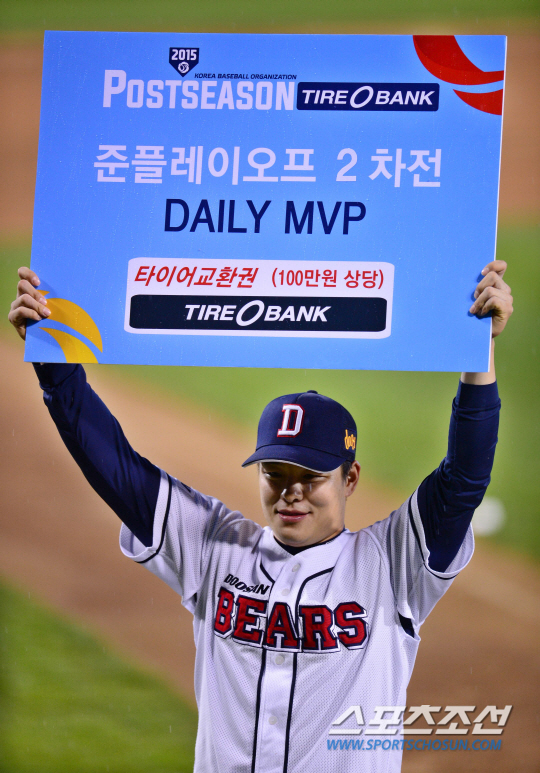 | 준PO 2차전서 데일리 MVP로 뽑혔던 민병헌은 13일 3차전서도 2안타를 뽑아내 14일 4차전서 3번타자로 선발 출전했다. 김경민 기자 kyungmin@sportschosun.com / 2015.10.11. |