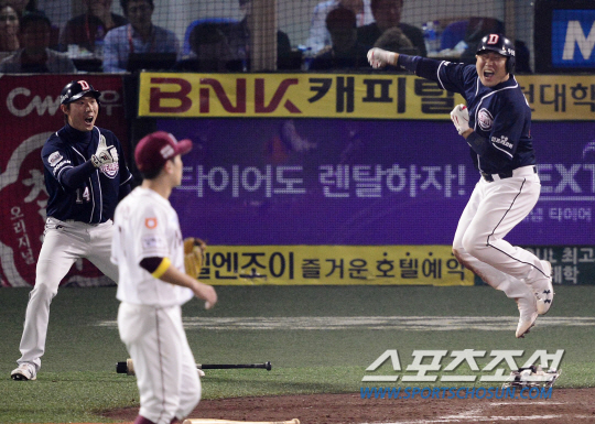 2015 프로야구 준플레이오프 4차전 넥센 히어로즈와 두산베어스의 경기가 14일 서울 목동야구장에서 열렸다. 두산 양의지가 9회초 1사 1,3루에서 2타점 역전 3루타를 치고 포효하고 있다. 목동=최문영 기자deer@sportschosun.com /2015.10.14/ |