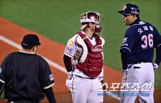 13일 서울 목동야구장에서 2015 프로야구 준플레이오프 3차전 두산과 넥센의 경기가 열렸다. 9회초 1사 1루서 두산 오재일이 이영재 주심에게 볼이 발에 맞아다고 이야기하고 있다. 목동=김경민 기자 kyungmin@sportschosun.com / 2015.10.13.