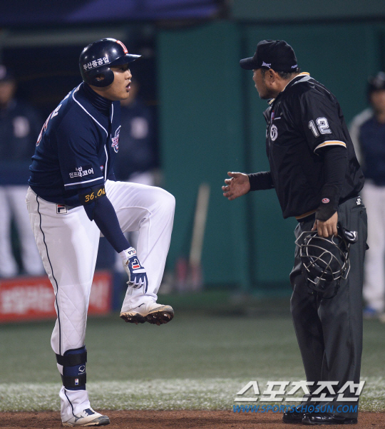 2015 프로야구 준플레이오프 3차전 넥센 히어로즈와 두산 베어스의 경기가 13일 서울 목동야구장에서 열렸다. 두산 9회초 1사 1루에서 오재일이 볼이 몸에 맞았다며 주심에게 항의 하고 있다. 목동=최문영 기자deer@sportschosun.com /2015.10.13/ |