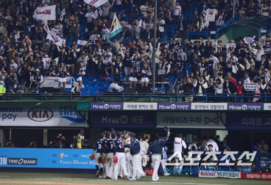14일 서울 목동야구장에서 2015 프로야구 준플레이오프 4차전 두산과 넥센의 경기가 열렸다. 11대9로 승리한 후 두산 김태형 감독이 관중들에게 인사하고 있다. 목동=김경민 기자 kyungmin@sportschosun.com / 2015.10.14.