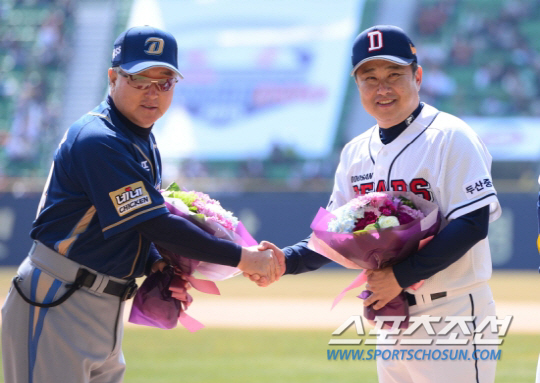 | 김경문 NC 다이노스 감독(왼쪽)과 김태형 두산 베어스 감독이 3월 28일 잠실구장에서 열린 개막전에 앞서 악수를 하고 있다. 김경민 기자 kyungmin@sportschosun.com |