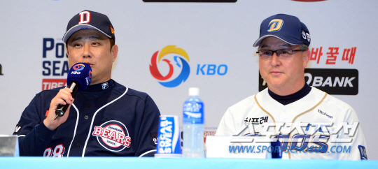 17일 오후 창원시 마산종합운동장 올림픽기념공연장에서 2015 프로야구 플레이오프 미디어데이가 열렸다.미디어데이에서 두산 김태형 감독이 취재진의 질문에 답하고 있다. 창원=김경민 기자 kyungmin@sportschosun.com