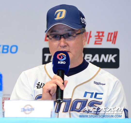 17일 오후 창원시 마산종합운동장 올림픽기념공연장에서 2015 프로야구 플레이오프 미디어데이가 열렸다. 미디어데이에서 NC 김경문 감독이 취재진의 질문에 답하고 있다. 창원=김경민 기자 kyungmin@sportschosun.com / 2015.10.17.