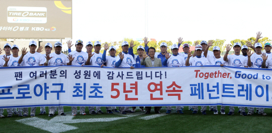 | ◇5년 연속 페넌트레이스 우승을 달성한 삼성 선수단. 하지만 한국시리즈를 앞두고 암초를 만났다. 사진제공=삼성 라이온즈 |