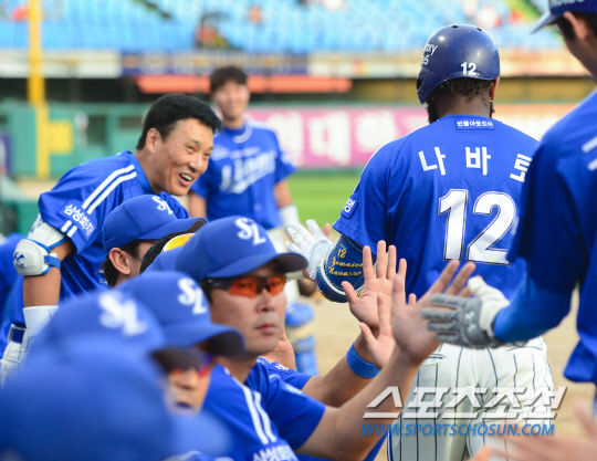 | ◇경기중 나바로의 홈런에 활짝 웃고 있는 이승엽(왼쪽). 눈을 돌리면 모범이 되는 선배들이 아예 없는 것도 아니다. 정재근 기자 cjg@sportschosun.com |