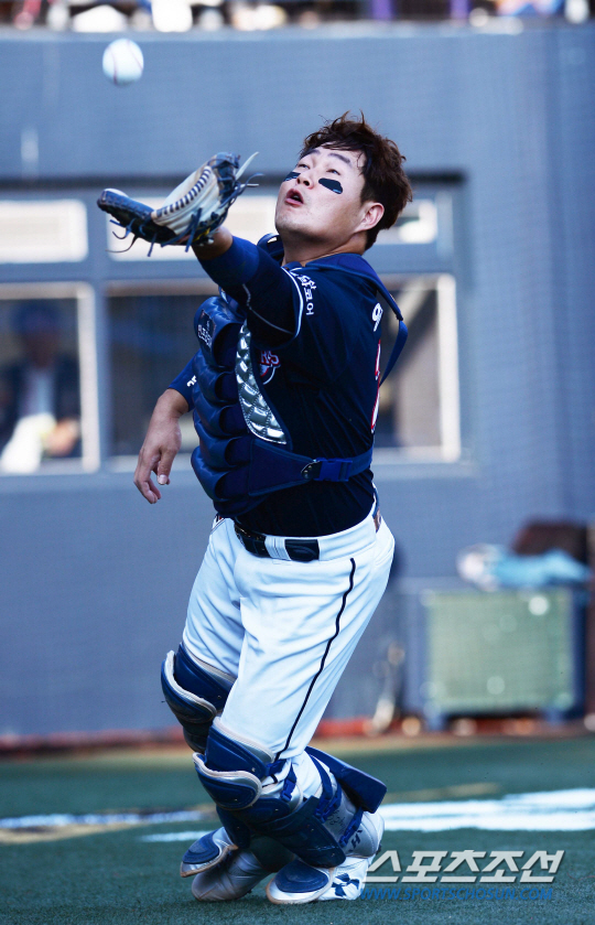 결국 양의지도 김 주심의 '의도하지 않은 방해'에 악영향을 받았다. 아무래도 앞쪽에서 계속 이동하는 김 주심을 의식하다보니 공을 충분히 따라가지 못한 것. 넘어지면서 캐치를 시도했으나 간발의 차이로 공을 미트 포켓에 넣지 못했다. 허탈하게 고개를 든 양의지도, 본의 아니게 수비 방해를 한 김 주심도 멋적은 웃음만 지었을 뿐이다.