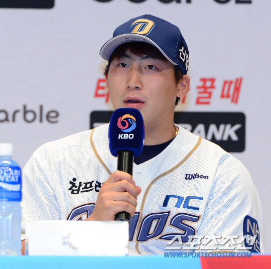 17일 오후 창원시 마산종합운동장 올림픽기념공연장에서 2015 프로야구 플레이오프 미디어데이가 열렸다. 미디어데이에서 NC 나성범이 인사말을 하고 있다. 창원=김경민 기자 kyungmin@sportschosun.com / 2015.10.17.