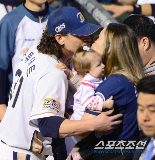 19일 오후 창원시 마산야구장에서 2015 프로야구 플레이오프 1차전 두산과 NC의 경기가 열렸다. 2대1로 승리하며 완투승을 거둔 NC 스튜어트가 부인과 키스를 하고 있다. 창원=김경민 기자 kyungmin@sportschosun.com / 2015.10.19.