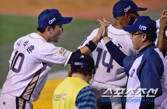 19일 오후 창원시 마산야구장에서 2015 프로야구 플레이오프 1차전 두산과 NC의 경기가 열렸다. 2대1로 승리한 후 NC 지석훈이 김경문 감독과 하이파이브를 나누고 있다 창원=김경민 기자 kyungmin@sportschosun.com / 2015.10.19.