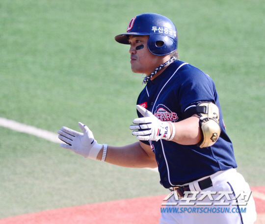 18일 오후 창원시 마산야구장에서 2015 프로야구 플레이오프 1차전 두산과 NC의 경기가 열렸다. 4회초 1사서 두산 홍성흔이 좌중월 솔로 홈런을 친 후 홈에서 환호하고 있다. 창원=김경민 기자 kyungmin@sportschosun.com / 2015.10.18.