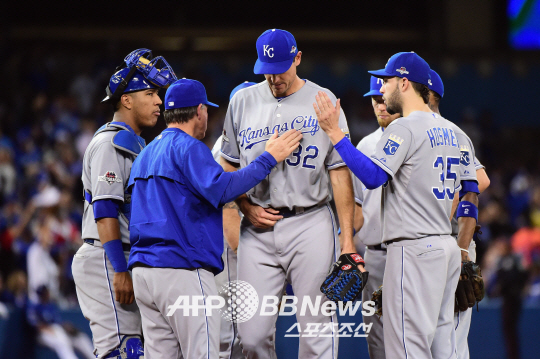 캔자스시티 선발 크리스 영이 21일(한국시각) 열린 아메리칸리그 챔피언십시리즈 4차전 선발로 나가 5회 투구 도중 강판하고 있다. 영은 4⅔이닝 2실점을 기록했다. ⓒAFPBBNews = News1