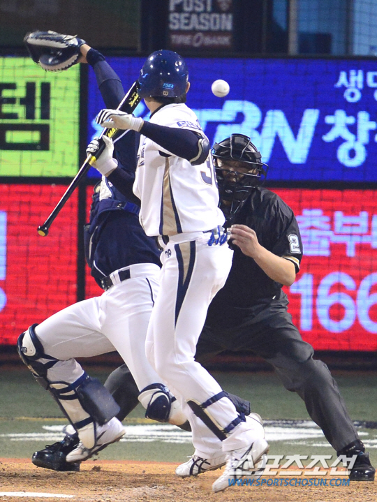 19일 경남 창원 마산야구장에서 KBO리그 플레이오프 2차전 NC 다이노스와 두산 베어스의 경기가 열렸다. NC 스튜어트와 두산 장원준이 선발 맞대결을 펼쳤다. NC 8회 1사 3루에서 김성욱의 스퀴즈번트 시도 때 두산 함덕주의 볼이 빠지며 3루주자 지석훈의 득점을 허용하고 있다. 창원=송정헌 기자 songs@sportschosun.com/2015.10.19