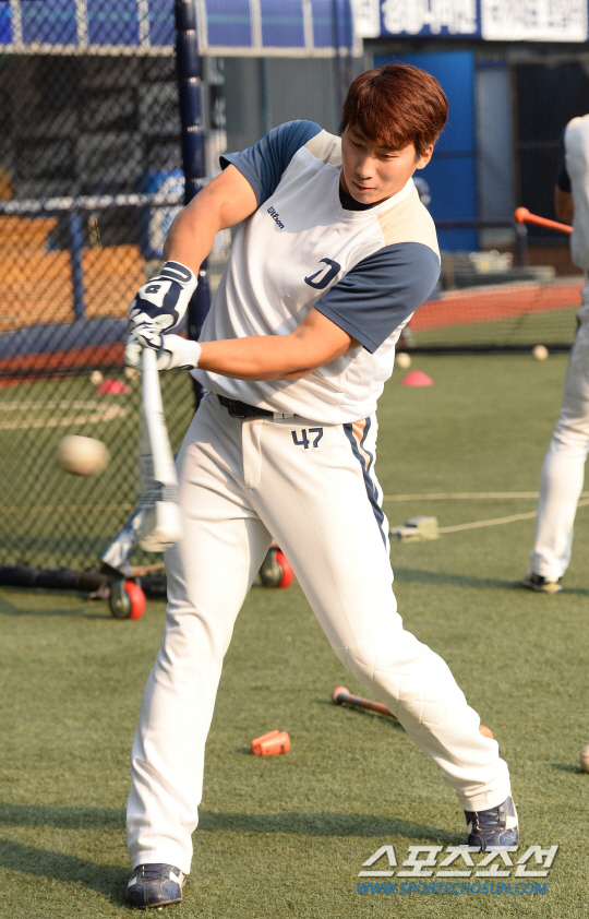 2015 프로야구 플레이오프 2차전 NC다이노스와 두산베어스의 경기가 19일 마산야구장에서 열렸다. 경기전, NC 나성범이 훈련용 사각배트로 타격감을 익히고 있다. 마산=최문영 기자deer@sportschosun.com /2015.10.19/