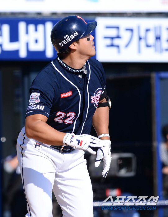 2015 프로야구 플레이오프 1차전 NC다이노스와 두산베어스의 경기가 18일 마산야구장에서 열렸다. 두산 홍성흔이 5회초 1사후 좌중월 솔로홈런을 치고 타구를 바라보고 있다. 마산=최문영 기자deer@sportschosun.com /2015.10.18/