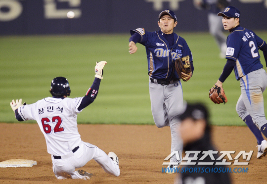 2015 프로야구 플레이오프 3차전 NC 다이노스와 두산 베어스의 경기가 21일 잠실구장에서 열렸다. 8회말 1사 1루 두산 오재원의 2루수 병살타 때 1루주자 장민석이 2루 포스아웃되고 있다. NC 유격수는 손시헌. NC는 선발투수로 시즌성적 11승 6패 방어율 4.89의 손민한을 내세웠다. 두산에서는 준PO 3차전 선발로 나왔던 유희관이 선발로 등판했다. 잠실=정재근 기자 cjg@sportschosun.com/2015.10.21/