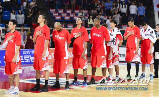2015-2016 남자프로농구 개막전 서울 SK와 전주 KCC의 경기가 12일 서울 잠실학생체육관에서 열렸다. SK 김선형이 불법 도박 혐의로 경기 출전이 보류돼 빠진 가운데 선수들이 경기 전 국민의례를 하고 있다. 잠실학생체육관=정재근 기자 cjg@sportschosun.com/2015.09.12/