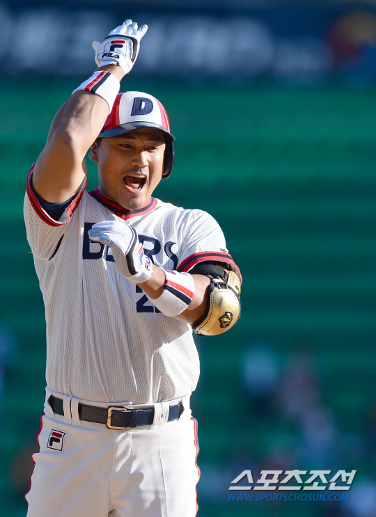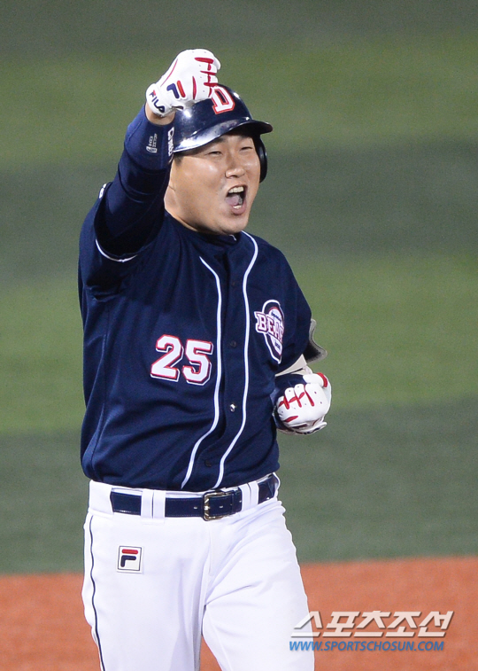 13일 잠실구장에서 KBO리그 두산 베어스와 kt 위즈의 주말 2연전 두 번째 경기가 열렸다. 최근 6연패를 기록중인 두산 장원준이 kt 저마노와 선발 맞대결을 펼쳤다. 7회 1사 1, 2루에서 대타로 나온 두산 홍성흔이 1타점 적시타를 날렸다. 1루에서 환호하고 있는 홍성흔. 잠실=송정헌 기자 songs@sportschosun.com/2015.09.13