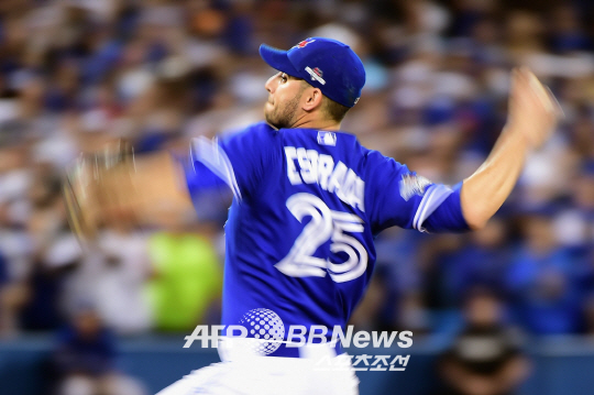 | 토론토 블루제이스 마르코 에스트라다가 22일(한국시각) 캔자스시티 로열스와의 아메리칸리그 챔피언십시리즈 5차전에 선발등판해 힘차게 공을 던지고 있다. 에스트라다는 7⅔이닝을 3안타 1실점으로 틀어막고 7대1 승리를 이끌었다. ⓒAFPBBNews = News1 |