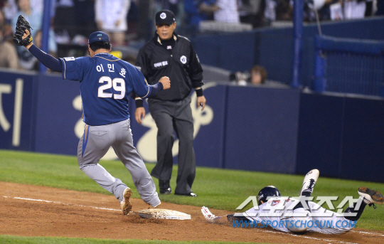 상황은 이랬다. 두산이 3-0으로 앞선 6회 2사 1,2루. 앞선 타석(5회)에서 1루 헤드 퍼스트 슬라이딩으로 내야 안타를 만든 정수빈이 다시 한 번 날았다. 1루 베이스 부근으로 땅볼을 때린 뒤 NC 1루수 테임즈가 베이스 커버에 들어간 투수 이민호에게 토스를 하자 몸을 던졌다. 하지만 이민호 1루심의 판정은 지체 없이 아웃. 정수빈은 곧장 벤치를 향해 네모를 그렸다. 비디오 판독을 해달라는 요청이었다.