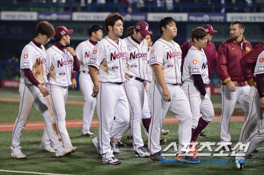 넥센 선수들이 준PO 4차전서 패한 뒤 팬들에게 인사하고 덕아웃으로 들어가고 있는 모습. 내년엔 유니폼에 넥센이 아닌 일본계 금융기업 J트러스트가 박힐 수도 있다. 김경민 기자 kyungmin@sportschosun.com