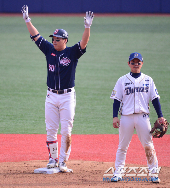 이어 허경민의 안타, 민병헌의 볼넷으로 만든 만루 찬스에서 4번 타자 김현수가 우측 펜스를 직격하는 역전 2타점 적시타를 쳤다.