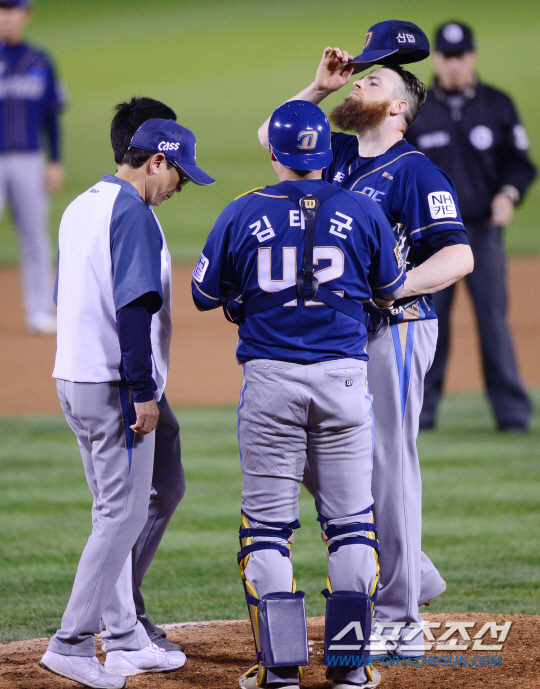 22일 오후 서울 잠실야구장에서 2015 프로야구 플레이오프 4차전 NC와 두산의 경기가 열렸다. 6회말 무사 만루서 NC 해커가 마운드에 오른 최일언 코치와 이야기를 나누고 있다. 잠실=김경민 기자 kyungmin@sportschosun.com / 2015.10.22. |