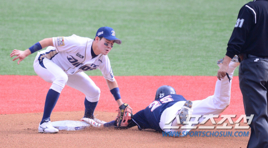 하지만 헤드 퍼스트 슬라이딩을 하는 순간 NC 2루수 박민우의 태그가 빨랐다. 스타트는 완벽했지만, 기본적으로 걸음이 느린데다 2차전에서 당한 오른 엄지 발가락 미세 골절로 탄력이 붙지 않았다.