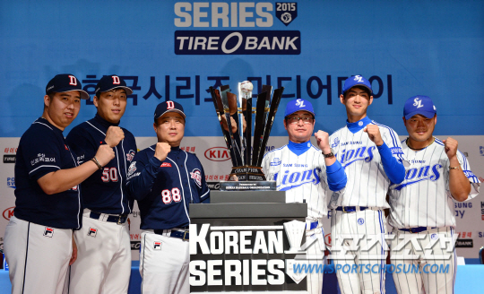 25일 대구경북디자인센터에서 2015 타이어뱅크 KBO리그 한국시리즈 미디어데이가 열렸다. 미디어데이에서 양팀 대표선수들과 감독들이 포즈를 취하고 있다. 이날 미디어데이에는 삼성 류중일 감독과 두산 김태형 감독을 비롯해 삼성의 박석민 구자욱, 두산의 유희관 김현수가 참석했다. 대구=김경민 기자 kyungmin@sportschosun.com / 2015.10.25. |