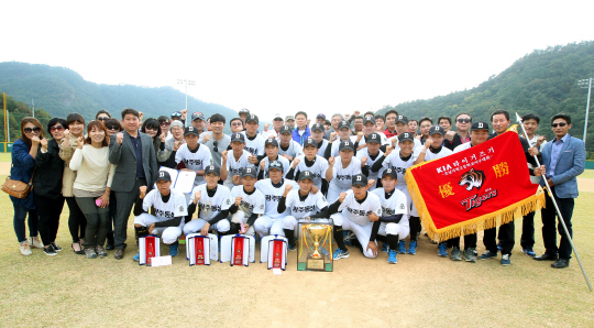 | 25일 전남 함평 대동야구장에서 열린 '제4회 KIA 타이거즈기 호남지역 고교 야구대회'에서 우승을 차지한 동성고 선수단이 우승기와 트로피를 들고 기념촬영을 하고 있다. 사진제공=KIA 타이거즈 |
