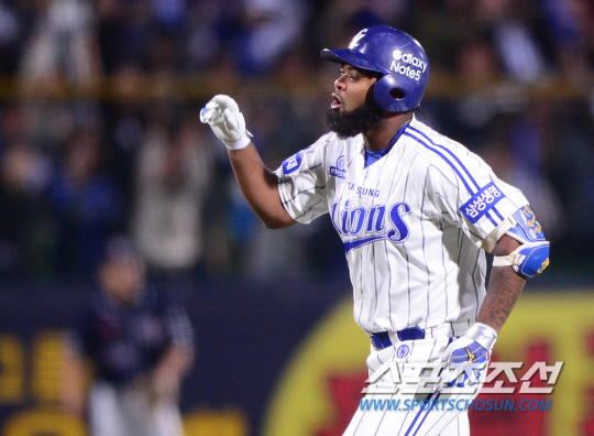 26일 오후 대구 시민야구장에서 2015 프로야구 한국시리즈 1차전 두산과 삼성의 경가 열렸다. 7회말 무사 1,2루서 삼성 나바로가 중월 3점 홈런을 친 후 기뻐하고 있다. 대구=김경민 기자 kyungmin@sportschosun.com