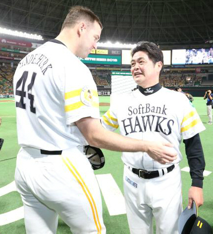 | 구도 기미야스 소프트뱅크 호크스 감독(왼쪽)이 호투한 릭 밴덴헐크의 호투를 치하하고 있다. 사진캡처=스포츠닛폰 홈페이지 |