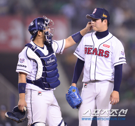 2015 프로야구 PO 3차전 두산과 NC의 경기가 21일 잠실 야구장에서 펼쳐 졌다. 두산 필승조 함덕주가 7회 무사 만루의 위기에 몰리자 포수 최재훈이 마운드에 올라 다독여 주고 있다. 함덕주는 곧바로 강판 당했다. 잠실=조병관기자 rainmaker@sportschosun.com/2015.10.21/