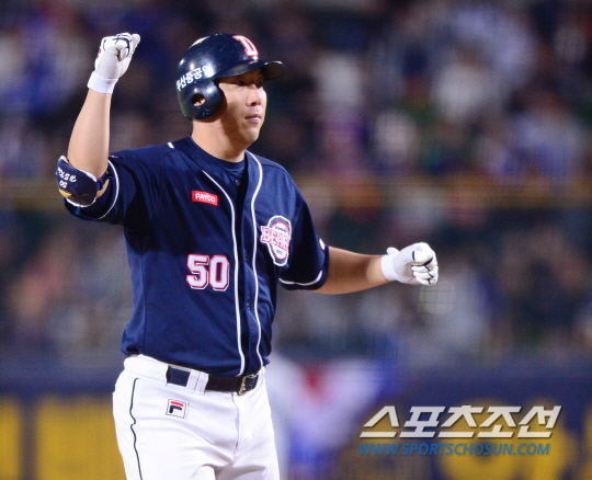26일 오후 대구 시민야구장에서 2015 프로야구 한국시리즈 1차전 두산과 삼성의 경가 열렸다. 6회초 1사 만루서 두산 김현수가 2타점 적시타를 친 후 1루서 기뻐하고 있다. 대구=김경민 기자 kyungmin@sportschosun.com / 2015.10.26. |