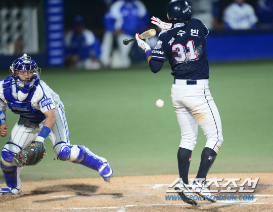 2015 프로야구 한국시리즈 두산과 삼성의 1차전 경기가 26일 대구구장에서 열렸다. 6회초 무사 1루 두산 정수빈이 번트를 대려다 손에 공을 맞고 있다. 고통스러워하던 정수빈은 장민석으로 교체됐다. 두산은 선발투수로 PS 2패를 기록한 유희관을 내세웠다. 삼성은 시즌성적 13승 7패 방어율 3.38의 피가로를 선발로 내세웠다. 대구=정재근 기자 cjg@sportschosun.com/2015.10.26/