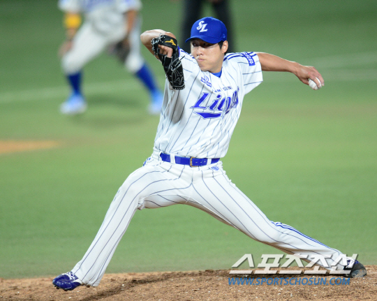 | 2015 프로야구 한국시리즈 두산과 삼성의 1차전 경기가 26일 대구구장에서 열렸다. 삼성 차우찬이 8회 1사 1, 3루에서 등판해 힘차게 공을 던지고 있다. 대구=정재근 기자 cjg@sportschosun.com/2015.10.26/ |