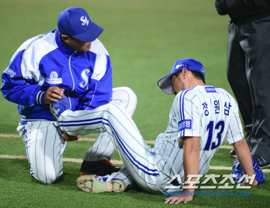 두산과 삼성의 2015 프로야구 한국시리즈 2차전 경기가 27일 대구구장에서 열렸다. 5회초 2사 1, 2루 두산 박건우의 타구에 발목을 맞은 삼성 장원삼이 주저 앉아있는 가운데 트레이너가 상태를 살피고 있다. 두산은 선발투수로 PS 2승을 기록한 니퍼트를 내세웠다. 삼성은 시즌성적 10승 9패 방어율 5.80의 장원삼을 선발로 내세웠다. 대구=정재근 기자 cjg@sportschosun.com/2015.10.27/