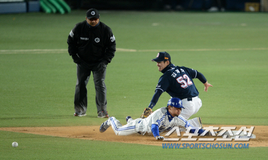 삼성과 두산의 2015 KBO 리그 한국시리즈 2차전이 27일 대구 시민구장에서 열렸다. 3회말 1사 1루 삼성 박한이 타석때 1루주자 김상수가 2루 도루를 성공하고 있다. 두산 포수 양의지의 송구가 뒤로 빠지며 김상수는 3루까지 진루했다. 대구=허상욱 기자 wook@sportschosun.com/2015.10.27/ |