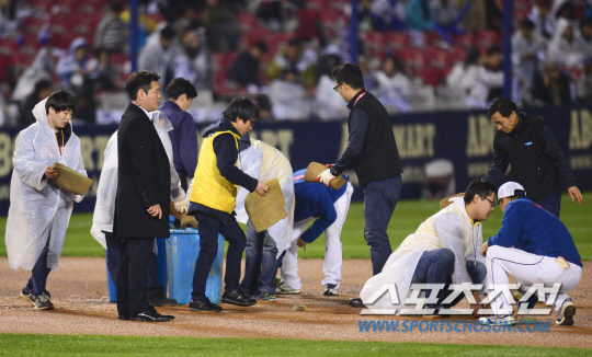 한국시리즈 3차전이 2차 우천중단 30분 만에 재개됐다.