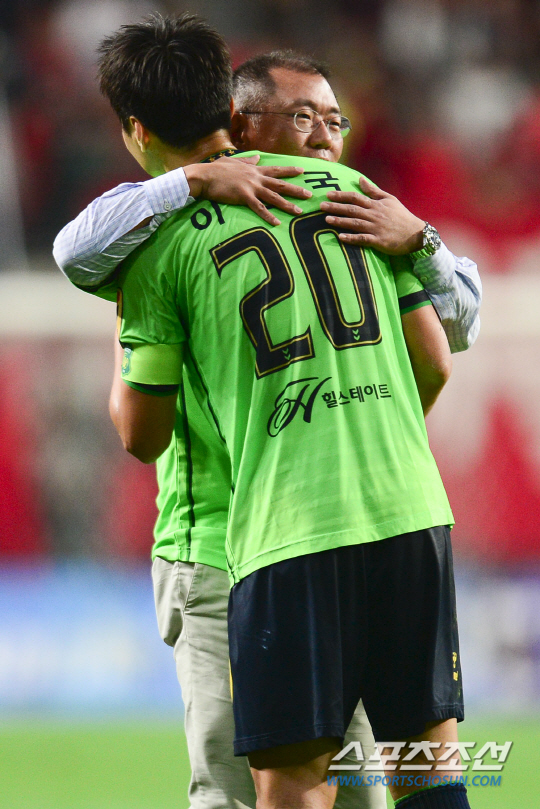 FC 서울과 전북 현대의 K리그 클래식 35라운드 경기가 25일 서울월드컵경기장에서 열렸다. 0-0 무승부로 경기가 끝난 가운데 정의선 전북 현대 구단주가 그라운드에 내려와 이동국과 포옹을 하고 있다. 서울은 최근 3연승을 달리며 승점 57점으로 4위를 달리고 있다. 3위 수원과는 승점 4점차. 1위 전북은 승점 68점으로 2위 포항에 6점 앞서있다. 서울월드컵경기장=정재근 기자 cjg@sportschosun.com/2015.10.25/
