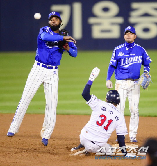 결국 사달이 났다. 나바로는 2루 베이스를 밟는 것과 동시에 점프했고, 곧바로 몸을 90도 틀어 송구했지만 1루수 채태인이 잡을 수 없는 곳으로 공이 날아갔다. 채태인은 뒤로 빠지는 것을 막고자 몸을 던졌지만 애초부터 포구는 무리였다. 3루 주자 오재일은 물론, 2루 주자 김재호도 홈인. 양 팀의 점수는 1-5로 벌어졌다.