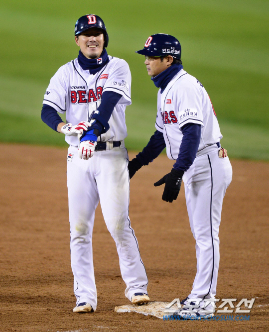 29일 오후 서울 잠실야구장에서 2015 프로야구 한국시리즌 3차전 삼성과 두산의 경기가 열렸다. 6회말 1사 1루서 두산 김재호가 기습번트를 성공시킨 후 강동우 코치와 환하게 웃고 있다. 잠실=김경민 기자 kyungmin@sportschosun.com / 2015.10.29. |