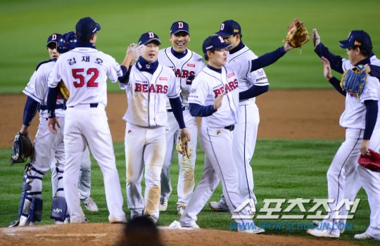 29일 오후 서울 잠실야구장에서 2015 프로야구 한국시리즌 3차전 삼성과 두산의 경기가 열렸다. 5대1로 승리한 두산 선수들이 하이파이브를 나누고 있다. 잠실=김경민 기자 kyungmin@sportschosun.com / 2015.10.29.
