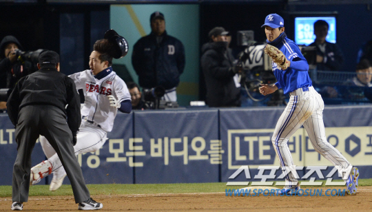 이 과정에서 1루로 쇄도하던 박건우가 삼성 1루수 구자욱의 미트에 얼굴을 부딪히며 그라운드에 쓰러졌다. 차우찬이 던진 공이 조금 휘어져 들어갔는데 구자욱이 팔을 뻗어 공을 잡는 순간, 박건우의 동선과 겹쳤다.