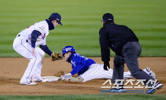 두산 투수 노경은이 7번 박한이에게 초구를 던질 때 박해민은 곧바로 2루로 달렸다. 박해민의 스타트가 빨라 도루가 성공할 것으로 보였다. 그런데 공이 스트라이크존으로 들어오자 박한이는 스윙을 했고, 파울.