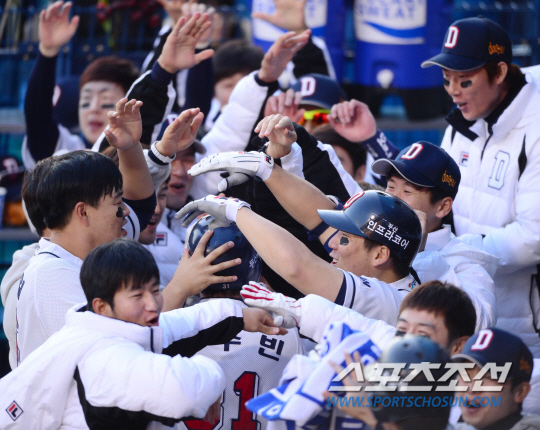31일 오후 잠실야구장에서 2015 프로야구 한국시리즈 5차전 삼성과 두산의 경기가 열렸다. 7회말 2사 1,3루서 두산 정수빈이 우중월 3점 홈런을 친 후 동료들과 환호하고 있다. 잠실=김경민 기자 kyungmin@sportschosun.com / 2015.10.31.
