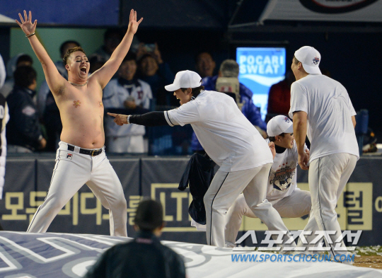 김현수와 홍성흔은 유희관의 상의 유니폼을 완전히 벗겨버렸다. 유희관은 거부하지 않고, 오히려 막춤을 추며 관중석을 열광의 도가니로 빠뜨렸다.